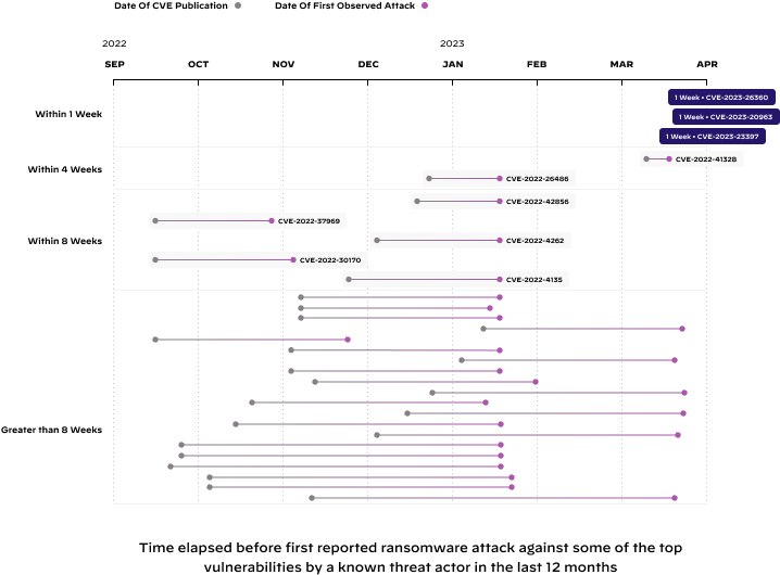 - Of the 15 remote code execution (RCE) vulnerabilities analyzed by Unit 42, 20% were targeted by ransomware gangs within hours of disclosure, and 40% of the vulnerabilities were exploited within 8 weeks of publication.