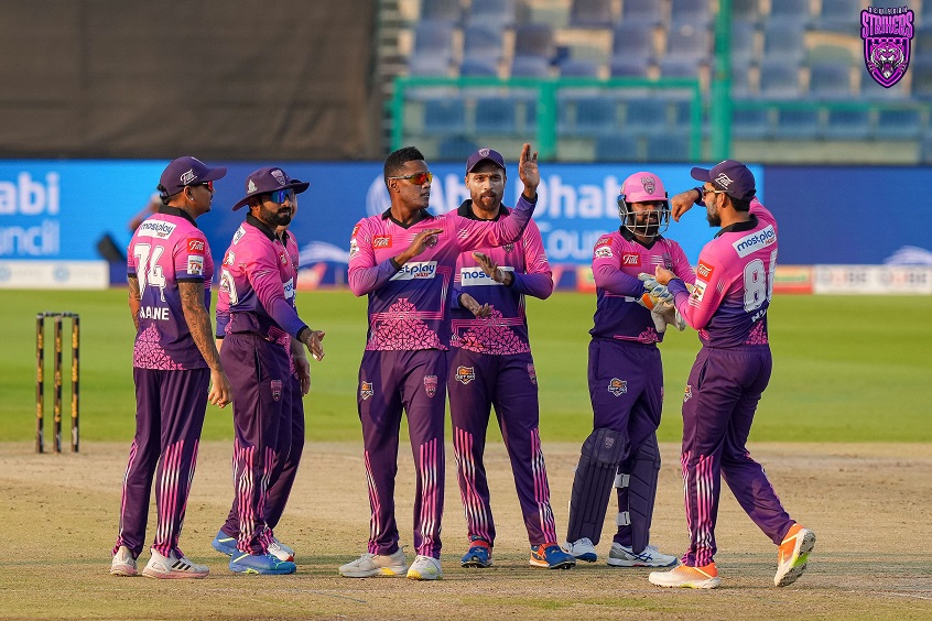 Abu Dhabi, 9th December 2023: It was a brilliant bowling effort from the New York Strikers in the First Qualifier of the seventh edition of the Abu Dhabi T10 on Friday, with Akeal Hosein picking a hat-trick in the first over against Morrisville Samp Army. With figures of 5/6 in 2 overs, Akeal restricted the opposition to 80/9 and New York Strikers won the match by 41 runs.