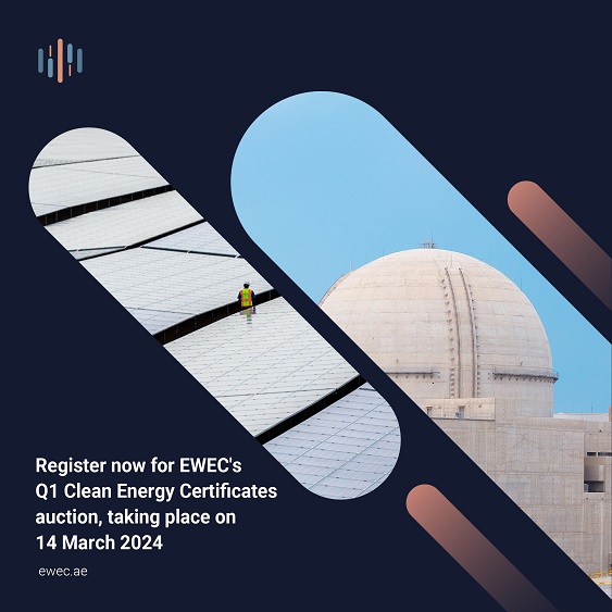 Abu Dhabi, UAE – 11 March 2024: EWEC (Emirates Water and Electricity Company), a leading company in the integrated coordination of planning, purchasing and supply of water and electricity across the UAE, today announced that registration is now open for its Q1 2024 auction for Clean Energy Certificates (CECs) in Abu Dhabi, with the auction scheduled to take place on 14 March 2024.