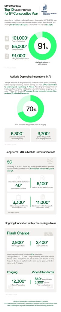 Dubai, UAE, 26 April 2024: Today, OPPO, a Leading global technology company, released its “OPPO Innovation and Intellectual Property White Paper” on World Intellectual Property (IP) Day, reaffirming its steadfast commitment to innovation and intellectual property protection. According to the World Intellectual Property Organization (WIPO), OPPO ranked ninth globally in patents filed under the Patent Cooperation Treaty (PCT) in 2023, making its fifth consecutive year in the global top ten. As of March 31, 2024, OPPO has filed over 101,000 patent applications globally, with more than 55,000 patents granted, and 91% of all patent applications are utility patents.