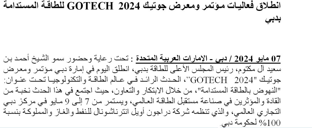 May 7, 2024 / Dubai, United Arab Emirates: Under the patronage and presence of His Highness Sheikh Ahmed bin Saeed Al Maktoum, Chairman of the Dubai Supreme Council of Energy, the GOTECH 2024 Conference and Exhibition kicked off today in the emirate of Dubai.