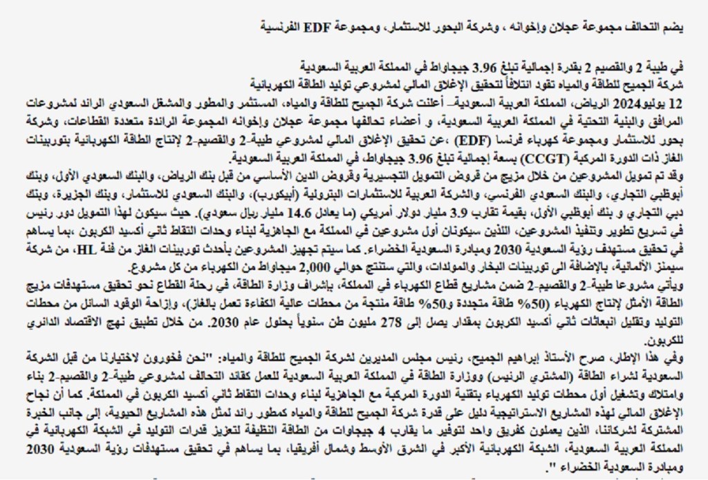 Business & Investments شركة الجميح للطاقة والمياه تقود ائتلافاً لتحقيق الإغلاق المالي لمشروعي توليد الطاقة الكهربائية July 12, 2024 uaenews247 Mr. Ibrahim Al Jomaih, Chairman of the Board of Directors of Aljomaih Energy and Water Company Related