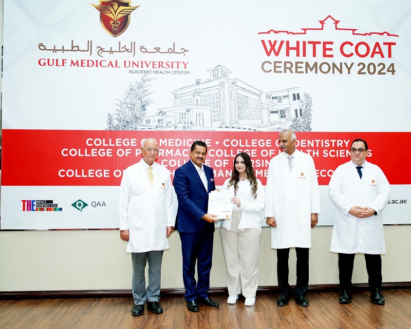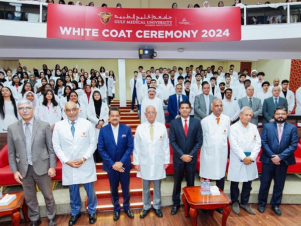 September 26, 2024: Welcoming the 2024 cohort of students across its six colleges, the Gulf Medical University conducted the time-honored tradition of the ‘White Coat Ceremony’ at the Al Jurf (Ajman) Campus on September 25, 2024. The event featured students publicly pledging their commitment to patient care, taking their oath in the presence of their families, esteemed leaders, and fellow peers.