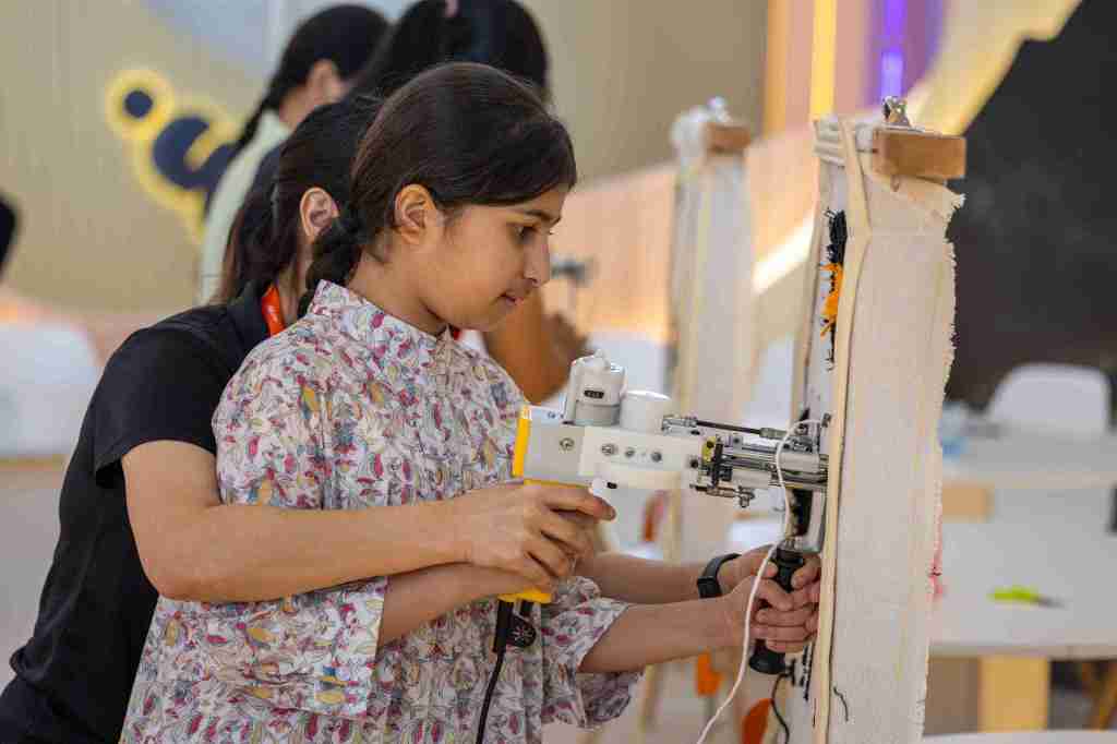“This is rug tufting, and we use yarn to make the pattern. The yarn is threaded on the gun first using a threader or a bent wire and then in a shooting action it weaves the design you want. We will then cut the patterns, make a keychain with it and present it to the kids to take home,” explained Ann, who along with her colleague Cherry from Mofun Studio in Umm Suqueim, Dubai has been training children at the workshop.