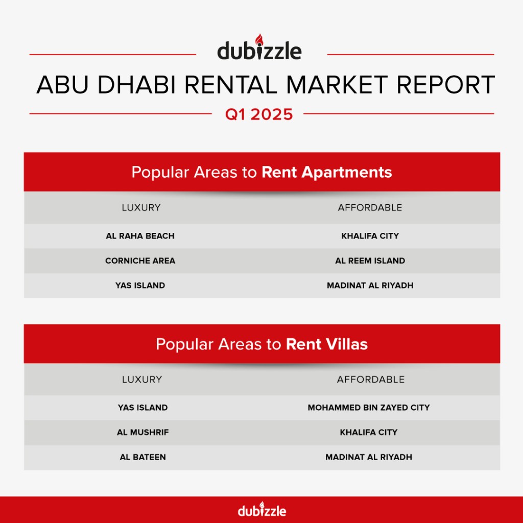 Based on dubizzle’s search trends, demand for rental villas and apartments in Abu Dhabi has risen in Q1 2025 when compared to Q4 2024. The most sought-after villas and apartment communities among tenants are listed below: