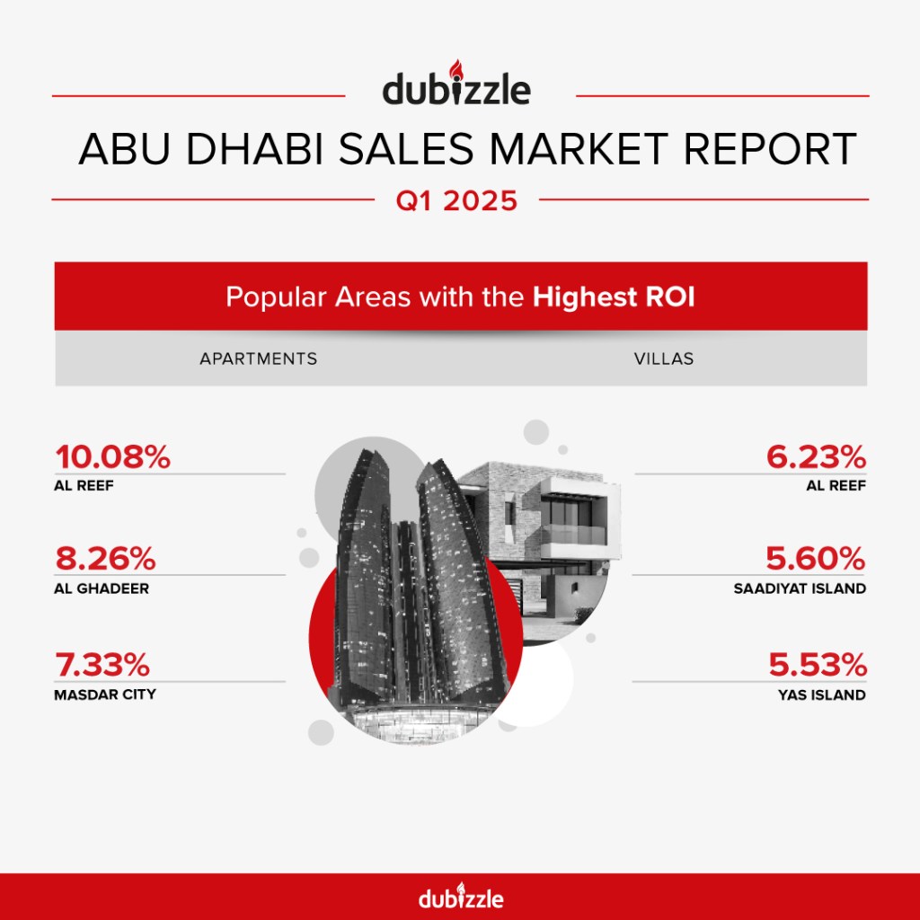 - Leading the segment, Al Reem Island has recorded an impressive ROI of 7.31%, with an average sales price of AED 1.54M. The area has seen a 3.57% increase in per-square-foot prices, increasing from AED 1,216 in the last quarter of 2024 to AED 1,259, in the first quarter of 2025.