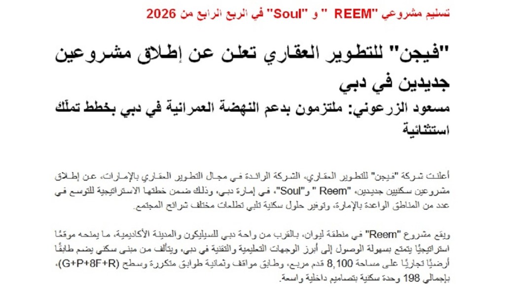 “فيجن” للتطوير العقاري تعلن عن إطلاق مشروعين جديدين في دبي
