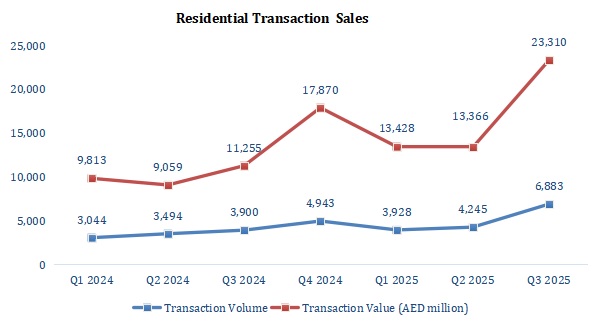 Dubai’s real estate market reached an unprecedented peak in Q3 2025, recording its highest-ever quarterly transaction volume. A total of 59,044 sales transactions were executed – a 17% year-on-year increase – with the total value surging by 19% to AED 169 billion. These results surpass all previous market highs, reinforcing Dubai’s status as a global capital magnet and safe investment hub, benefiting from sustained international capital inflows and population growth.
