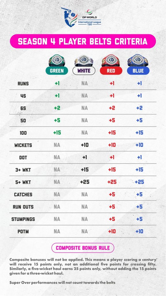 Dubai, 11 December 2025: The race for the four iconic belts — the Green (Best Batter), White (Best Bowler), Red (Most Valuable Player), and Blue (Best UAE Player) — is officially underway at the DP World International League T20 Season 4. With the competition in full swing, players across all six teams are eyeing these prestigious honours, adding an extra layer of intensity to every outing. The tournament has already thrilled fans, delivering a series of nail-biting encounters, including the first Super Over in the league’s history.