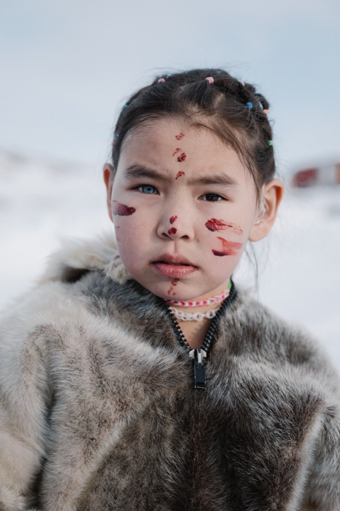 21| From Ciril Jazbec’s gallery “SILA”, a photograph portrays Leona Mikaelsen, a young Inuit girl with striking mismatched eyes, watching as a local hunter opens a freshly caught seal at the remote Uumannecha Camp on Ikerasak Island.
