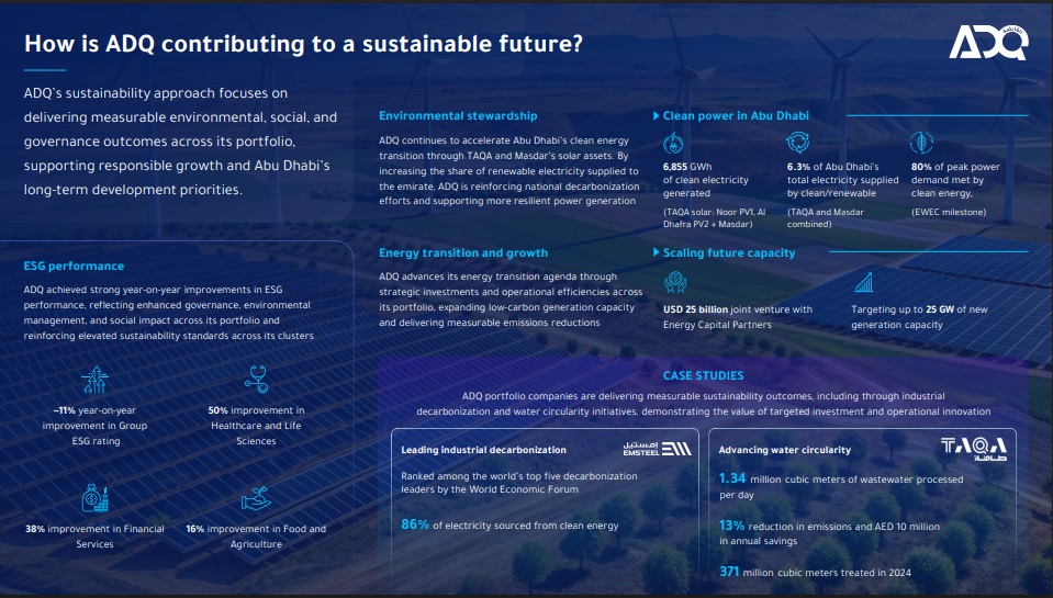 ADQ has achieved tangible progress across a range of sustainability indicators, including strengthened Group and portfolio ESG performance, increased clean and renewable energy generation, emissions reductions, and advances in industrial efficiency and water management. The organization also highlighted practical applications of decarbonization and the circular economy across its portfolio, showcasing achievements in industry, energy, water systems, and resource efficiency.