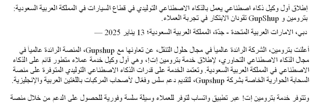 Dubai, UAE; Jeddah, Kingdom of Saudi Arabia, 13 January 2025- Petromin Corp, a global leader in mobility solutions, has partnered with Gupshup, the leading conversational AI platform, to introduce PETROMINit!, a first-of-its-kind advanced Customer Service AI Agent in the Kingdom of Saudi Arabia. The AI Agent leverages Generative AI capabilities on Gupshup Conversation Cloud to offer seamless and efficient vehicle support in both Arabic and English.